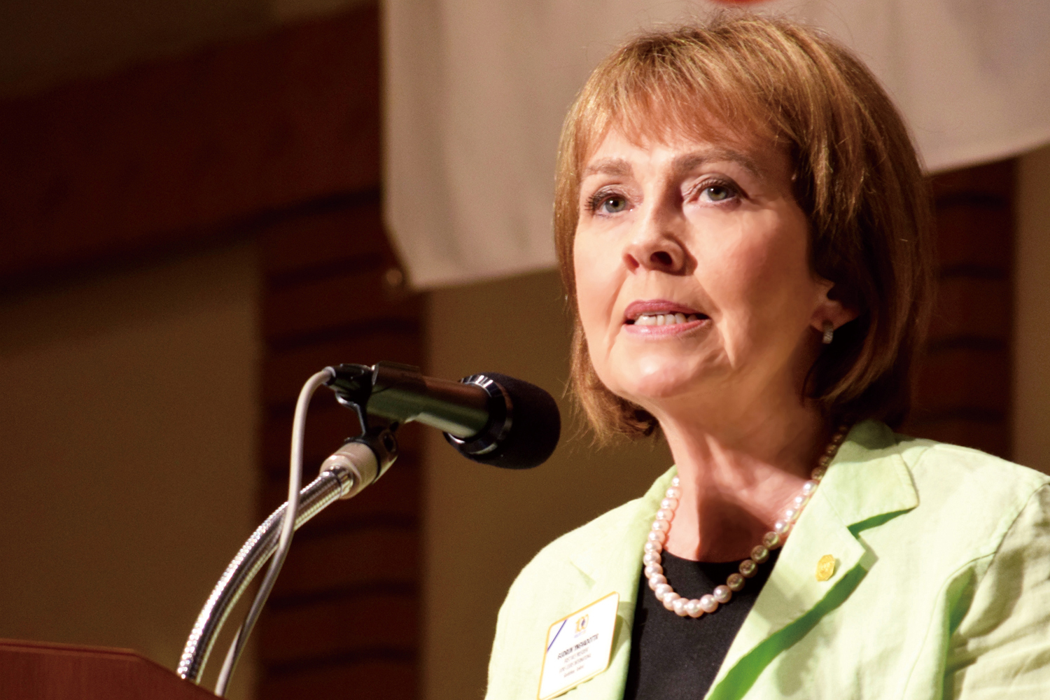 これを進める上で、常に前向きな思考で、創造的・革新的に、開かれた心で新しいことに取り組んでほしいと話した。また次年度の優先事項として、新たに入会する会員の男女比を50対50にする目標を挙げ、女性が初めて国際会長の重職に就任する機会を利用して、より多くの女性がライオンズクラブに加わるよう努力してほしいと呼び掛けた。
