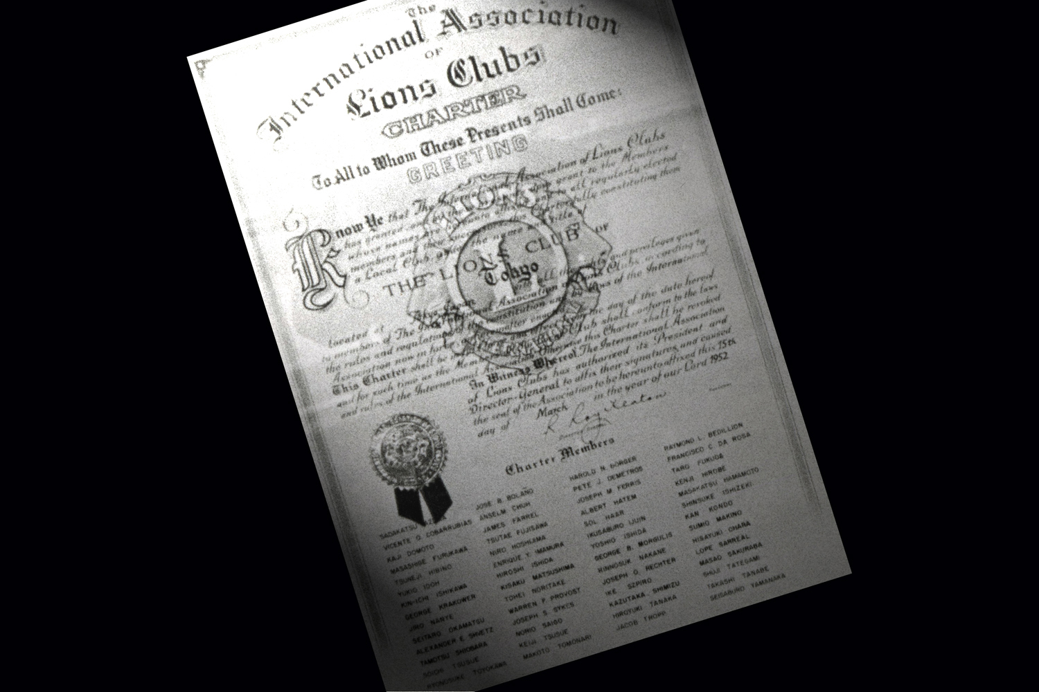 すると今度はシカゴの国際本部から「3月に国際第1副会長が訪日するから、その機にチャーター・ナイトを開催するように」との連絡がきた。さあ大変。ライオンズを知ったばかりの日本人たちはとりあえず受け売りで意図を説明し、日本語を話せないバレネンゴアは在日外国人をターゲットにして、必死に会員を勧誘した。そうして何とかチャーター・ナイトまでに集めた会員29人は、10人が外国人。式典の司会進行は英語で行われた。
