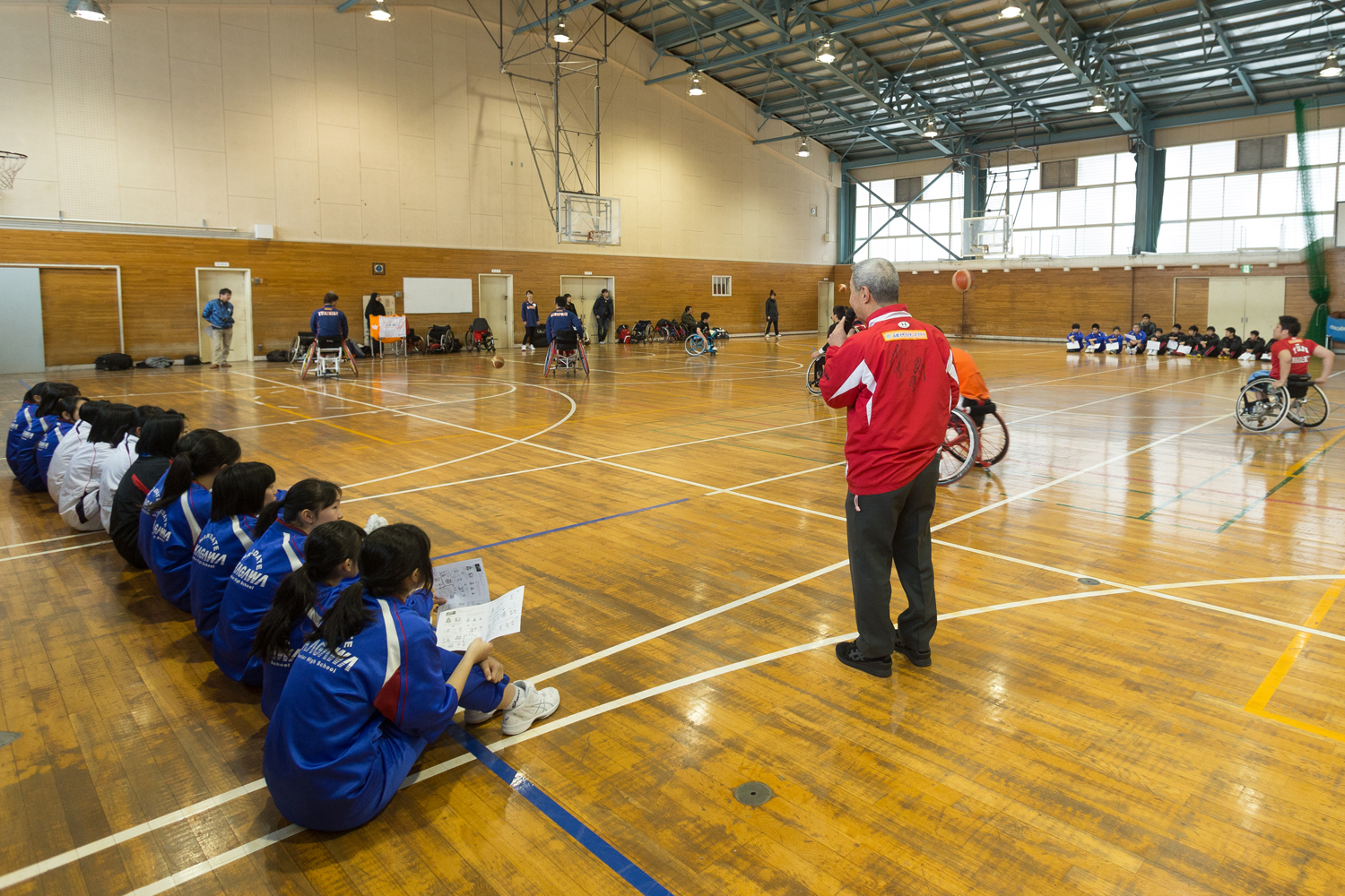 体験教室ではまず、ハダーズの須藤由司コーチが中心となって、ルールなど車椅子バスケットボールの基本を説明。次いで選手たちが、車椅子の直進、ターンなどの操作方法や、ドリブル、シュートなどの実技を披露した。その後、生徒たちはハダーズの選手から指導を受けながら競技用の車椅子に乗ってみたり、ハダーズの選手たちとの混合チームで体験ミニマッチを行ったりして、車椅子バスケットボールを体験した。
