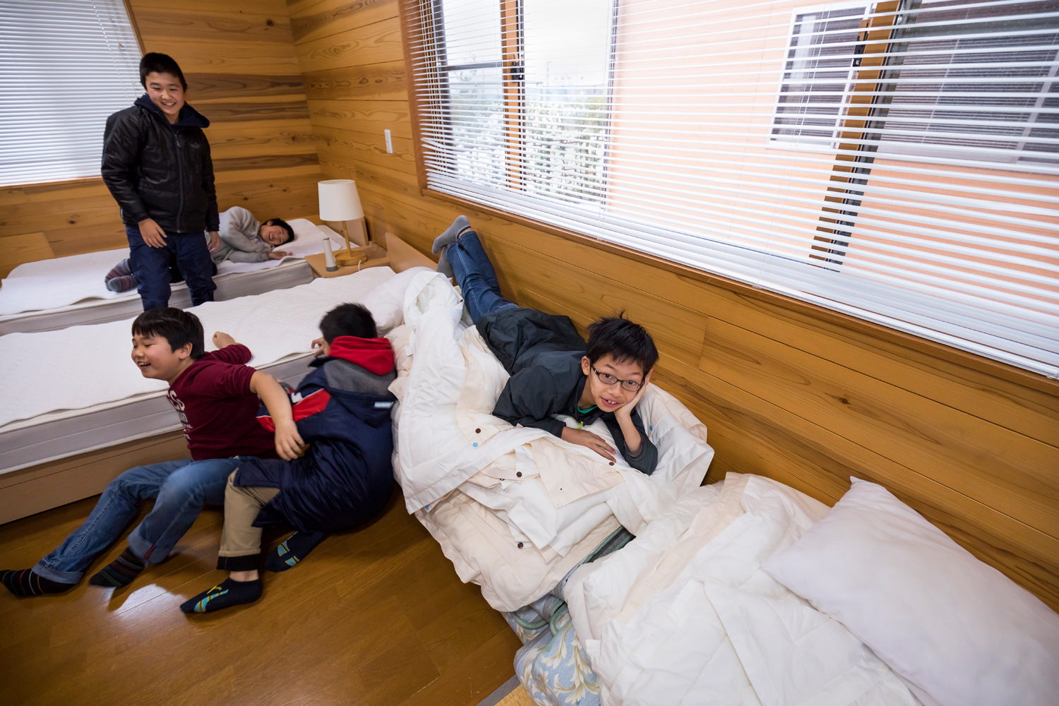 子どもたちの就寝場所は班ごとに分かれたコテージ。大人は近くのコテージで就寝し、何かあった時に備えているが、介入はしない。子どもたちの交流を考えてのことだ。