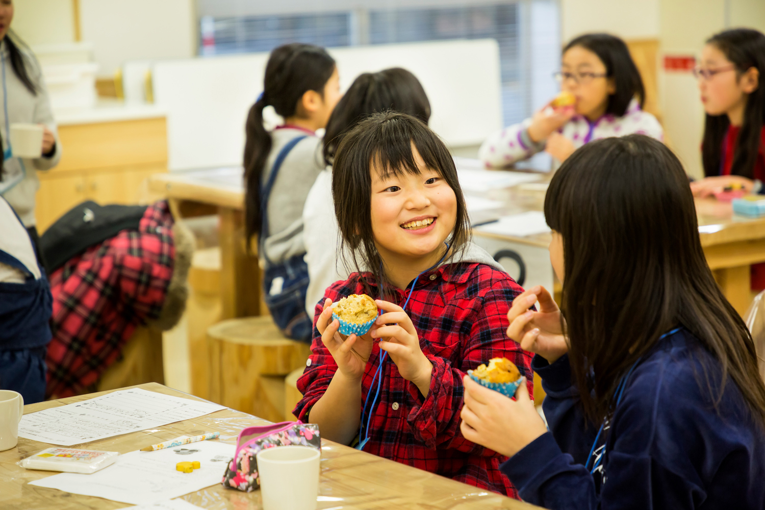 続いてカップケーキ作りを体験。みそ汁に比べて少し複雑な工程が含まれていたが、全員で力を合わせて作っていく。小麦粉や卵を混ぜた生地の上に小さいチョコレートクッキーを乗せオーブンへ。