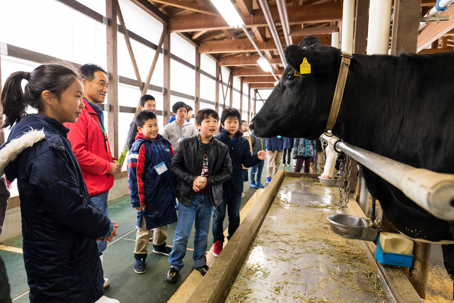 カップケーキを食べた後は畜舎でのえさやり体験だ。牛やヤギと直接触れ合うことが出来る。入り口にはメンバーが立ち、子どもたちに足下の消毒と手洗いを徹底させていた。えさやりの後はアグリパークの職員が牛やヤギの生態や、雑学をクイズ形式で披露。牛が1日に20kgもの牛乳を出すことを紙パックで表した際には、子どもたちは皆驚いていた。