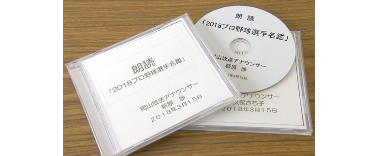 音読する本は、岡星寮の利用者から最も要望の多かったプロ野球選手名鑑とした。岡山放送の久保さち子アナウンサーと萩原渉アナウンサーが、音のノイズが入りにくい特別仕様のマイクを使い収録した。間の取り方、スピード、音の高低、滑舌に気を配り、紙をめくる音や、机に手が当たる音など、雑音が入らないよう注意しながら収録した。岡星寮からは「利用者には野球ファンが多く、このCDを楽しみに待っていました。CDを聞くことで、今シーズンの野球がより楽しめるのでは」という声が届いている。