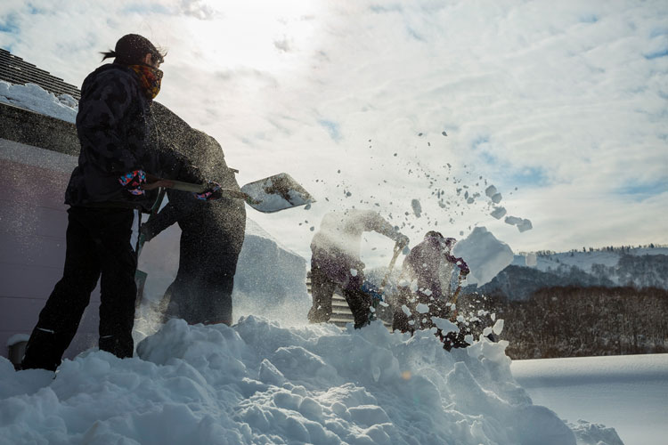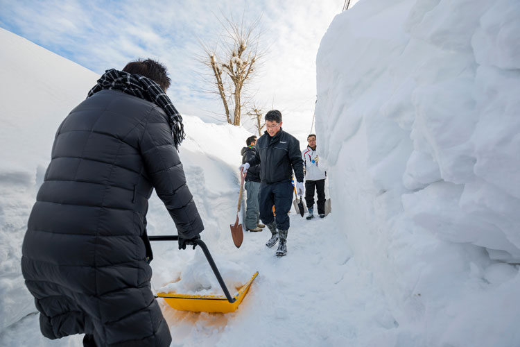 この日の目標は1階の窓の部分まで雪を取り除き、日光が入るようにすること。今年は深川西高等学校の野球部員たちが協力してくれることになったので、2棟の除雪をする。ただし、危険が伴うので、屋根の除雪は極力しないようにしている。