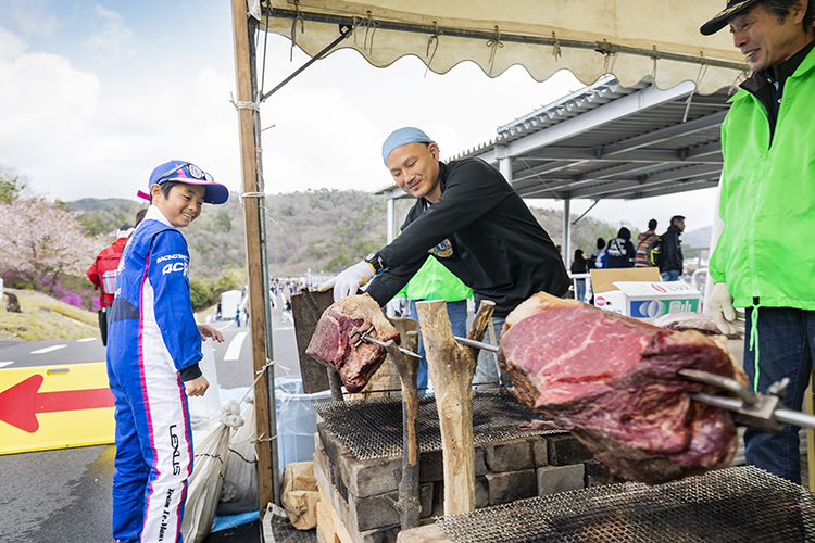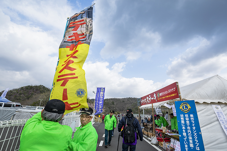 開幕戦は毎年、岡山国際サーキットで開催される。全国からファンが訪れるこのレース会場で、美作ライオンズクラブ(中村末廣会長/15人)はテキサスステーキを販売している。「テキサスステーキ」というのはクラブの造語。もともと、湯の郷温泉で実施されていたハーレーフェスティバルに出店しており、肉の塊をその場で焼き、切り取って販売する豪快なスタイルから名前をつけた。その派手な見た目とキャッチーなネーミングが、今はSUPER GTファンの心をつかんでおり、2日間で150kg以上を売り上げる大会の名物メニューとなっている。毎年楽しみにしてくれていて、テントで準備をしていると「まだ肉焼けないの?」と話し掛けてくる人もいるという。