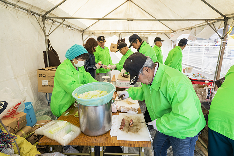 そして、事業の成功を語るのに欠かせないのが、会員の夫人たちの存在だ。昨年から始めたおにぎり販売では朝6時から彼女たちが握ったものを現地で販売している。会員よりも朝早くから働いてくれているのだ。現地ではパックを準備し、レタスを入れ、輪ゴムをかける、など手が止まることがない。ほぼ立ちっぱなしで肉を焼き続ける会員もハードだが、彼女たちの働きなくしては、お客様に肉を届けることは出来ないのだ。