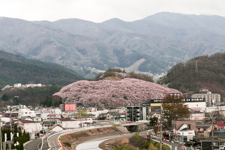 2017年春、JR東日本「大人の休日倶楽部」のポスター。吉永小百合さんが腰を下ろした緑の丘の下には満開の桜と市街地が広がり、遠く北アルプスの山々も見える。まるで雲海のように、周囲をぐるりと桜に囲まれた景観は、弘法山古墳からの眺め。その独特の風景は小説や漫画にも描かれている。2015年に同名の漫画を実写化した映画『Orange』には、東京から松本に転校してきた主人公に、「弘法山の桜はすごいんだぜ!」と友人たちが熱弁する印象的なシーンがある。松本アルプス ライオンズクラブが植樹をしてから34年を経て、弘法山古墳は信州でも指折りの桜の名所になった。1993年からは地元の並柳商工会(大嶋健資会長)が中心になって弘法山古墳桜まつりを開いている。今年は平年より1週間以上早く迎えた満開に合わせて、4月8日にまつりのオープニングを兼ねたコンサートが催された。期間中には絵画・写真のコンクールや短歌の募集があり、夜間のライトアップも行われ、地元はもちろん全国各地から花見客が訪れる。取材時は黒い雨雲がかかり、強風が吹き付けるあいにくの天候だったが、遠足でやってきた地元の小学生や若いカップルに混じって、外国人観光客のグループの姿もあった。