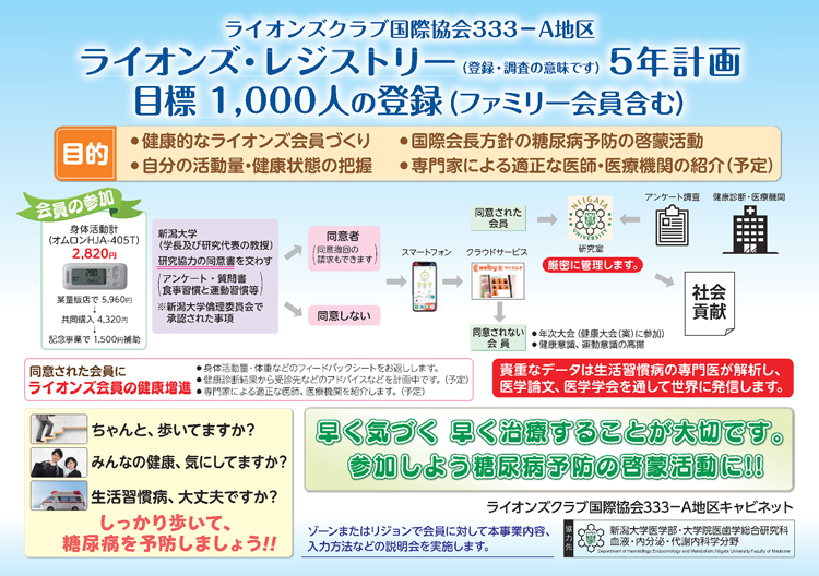 昨年度のナレシュ・アガワル国際会長は、最重点奉仕活動を「糖尿病予防」と位置付けられた。これを受けて333-A地区(新潟県)では、GSTセミナーで糖尿病の専門医新潟大学の曽根博仁教授からご講演を頂いた。お話を聞いた私たちは、糖尿病の啓発活動を実践するためには、専門医の方々からご指導を頂くことが大切ではないかと活動の方向を定めた。その結果、地区年次大会の記念事業として「ライオンズ・レジストリー」を取り上げた。レジストリーとは「登録、調査」という意味。賛同したライオンズ会員が身体活動計を身に付け、そのデータを生活習慣病の研究に生かすと共に、会員の健康増進や糖尿病予防の啓発を図る活動だ。
