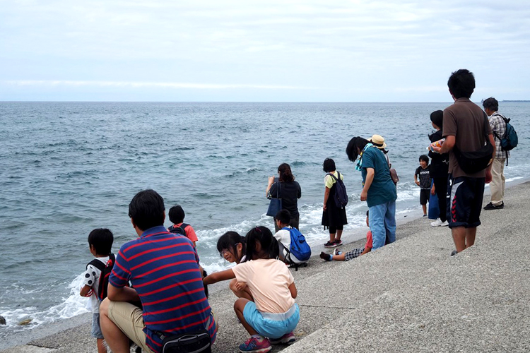 昼食は水族館の近くの海の駅「蜃気楼」にて、海の幸を炭火で焼いて食べる浜焼きを全員で頂いた。また食事会場が海のすぐ脇だったため、食べ終わった子どもたちは浜辺に出て海の風景を満喫。山に囲まれた長野県の子どもたちにとって海岸は大変興奮するらしく、大喜びではしゃいでいた。