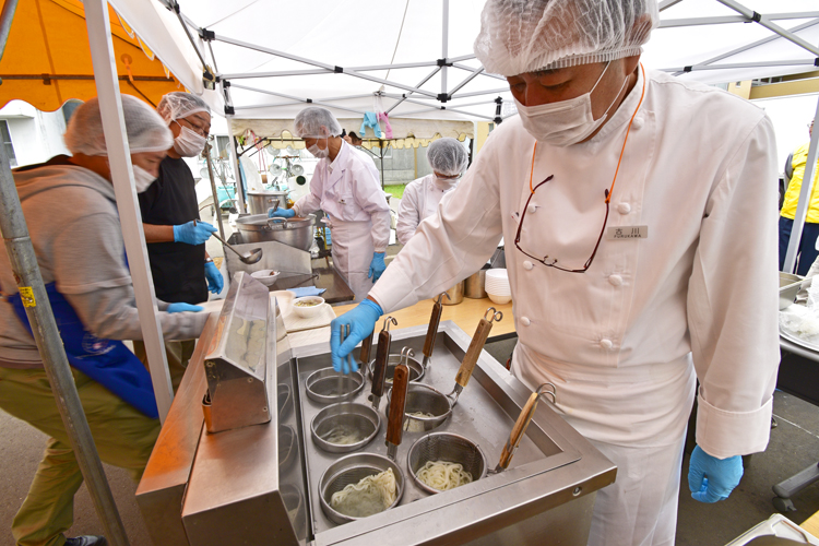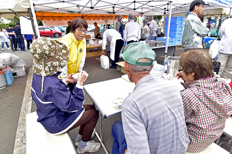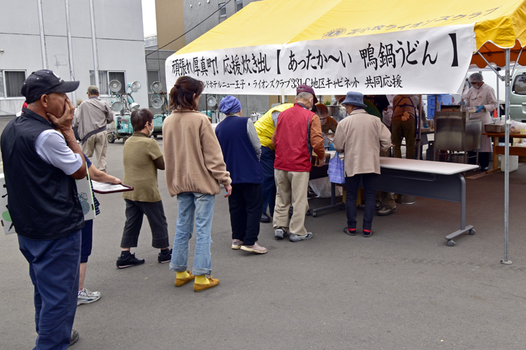 炊き出しメニューは、グランドホテルニュー王子の名物料理「鴨鍋」のこだわりスープを使った鴨鍋うどんで、温かいうどんとおいしいスープに、被災された方たちは笑顔で舌鼓を打っていた。この鴨鍋に使うアイガモは、北海道滝川市にある障害者授産施設で肥育したもので、ホテルでは全て同施設のアイガモを使っている。鴨鍋セットとして販売しているほどの自信作で、味見をしたライオンズの会員たちもスープのおいしさにうなっていた。炊き出しはこの後、29日にスポーツセンター、30日に厚南会館と、厚真町にある三つの避難所全てで実施。9月後半になって急に冷え込んできた被災地に温かい心を届けた。