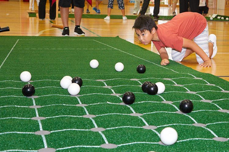 この日参加した人の多くが未経験者とあって、開会式後のルール説明では、子どもも大人も皆、この未知のスポーツの説明に聞き入った。黒、白のチームが交互にボールを打ち、それぞれ10個を打ち終わったところで点数を集計。それを3度繰り返して勝敗を決する。くぼみにボールが収まると「ポイント得点」が加算されるのだが、縦横斜めのいずれかに3個から5個のボールを並べると「ライン得点」と呼ばれる得点になる。いくらポイント得点を稼いでも、勝敗はこのライン得点で決するところがこの競技の醍醐味だ。