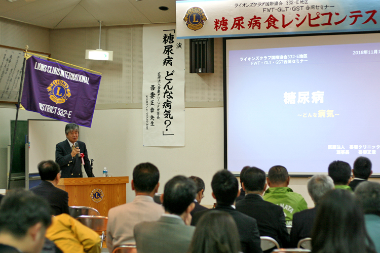 レシピコンテスト当日は、浅賀地区ガバナーを始め、角田裕一GSTエリアリーダー、竹下直義332複合地区議長などの来賓を含む、112人もの方に参加して頂いた。セミナーではまず、大石田ライオンズクラブ会員で医師の吾妻正章先生による「糖尿病 どんな病気?」の講演と活発な質疑応答を通して、糖尿病について理解を深めることが出来た。