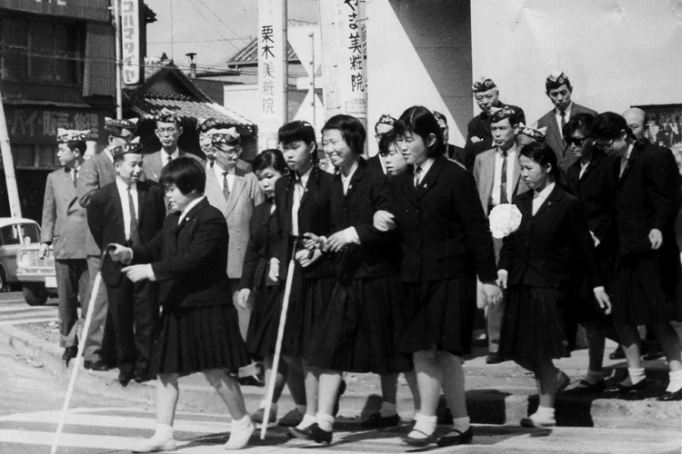 視覚障害者のための総合福祉施設・日本ライトハウスの岩橋英行理事長(当時)は、『ライオン誌』68年3月号に「盲人を交通戦争から守ろう」という記事を寄稿している。自身も視覚障害があった岩橋氏は、大阪城東ライオンズクラブのメンバーでもあった。記事では、日本の交通戦争が日々激しさを増す中で、視覚障害者への公的な対策は全くと言ってよいほど取られていない現状に言及。欧米では2年間の特別な歩行訓練コースが設けられており、日本でもこのような訓練コースが求められること。しかし実現までには数年を要するだろうから、その前に視覚障害者を守るための喫緊の処置が必要であると述べている。その一例として挙げたのが、京都のライオンズが市内で取り組んでいた点字ブロックの設置だ。今でこそ日本中の歩道や駅などに敷設されているが、当時岡山にある安全交通試験研究センターで開発されたばかりのものだった。横断歩道、プラットホーム、陸橋のたもと、階段の始まりに点字ブロックが設置されると、視覚障害者からとても喜ばれた。
