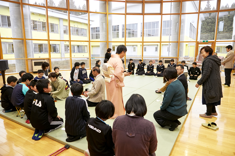 毎年、教育委員会を通じて参加校を募り、200人分の予算を確保。年間3~4校ペースで実施し、今期も3回の小学校訪問を計画している。この日、茶道体験を行った四和小学校は、2013年に近隣の三つの小学校が統合して出来た学校。翌14年に出来た真新しい校舎には四和中学校が隣接している。本来であれば全部で43人の小学生が参加対象だが、せっかくの機会なので中学1年生の全生徒6人にも参加してもらった。