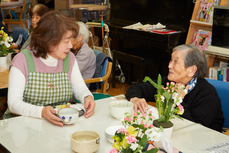 この日の活動には7人のメンバーが参加。エプロン姿になって施設の方と連携し、花材の準備や利用者が花を生ける手伝いをし、抹茶をたてて振る舞った。ただ利用者はほとんどがリピーター。サポートを必要としないほどに手慣れた様子で花を生けていく。あっという間に完成させて、花を眺めながらおしゃべりに興じる姿が目立った。テーブルの上に色鮮やかな花が並ぶと一気に空間が明るくなり、隣の人との会話もいつも以上に弾むようだ。利用者は自分が生けた花を自宅に持ち帰り、玄関や窓辺に飾って楽しんでいるという。