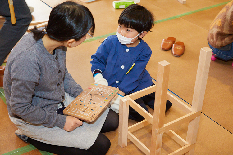 この教室に間に合わせるよう、材料を加工するのは冬の寒い時期だ。緻密な作業も求められ、なかなか大変だが、休憩時間を設けて和気あいあいとした雰囲気で準備しているという。当日、工作教室の開始前には材料を今一度チェックし、場合によっては参加者が組み立てやすいように微調整を施す。こうした工夫がなされているため、普段は工作をしていない園児たちでも簡単に作ることが出来る。親の手を借りるばかりでなく、自分で出来ることが多いため、園児たちは皆、楽しんで作業していた。