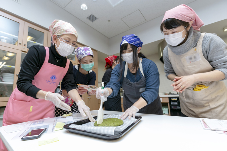 開会後はまず、成田赤十字病院の栄養課長で管理栄養士の高師さち子さんによる健康と食事、栄養に関する講義。貧血予防のポイント、鉄分やビタミンの効果的な摂取の仕方などが説明され、参加者はメモを取りながら熱心に耳を傾けた。続いて和洋女子大学ボランティア部の学生がレシピのポイントを説明しながらデモンストレーションを行い、六つのグループに分かれて調理実習をスタート。材料の計量や道具類は開会前にライオンズのメンバーと学生たちが準備しておいたこともあり、参加者は手際良く調理を進めていった。パンナコッタを冷蔵庫に、スコーンをオーブンに入れたら、待ち時間を利用して再び講義。千葉県赤十字血液センターの大屋秀人さんから、血液の働きや、献血がどのようにして治療に生かされているかなど「血液まめ知識」の話を聞いた。