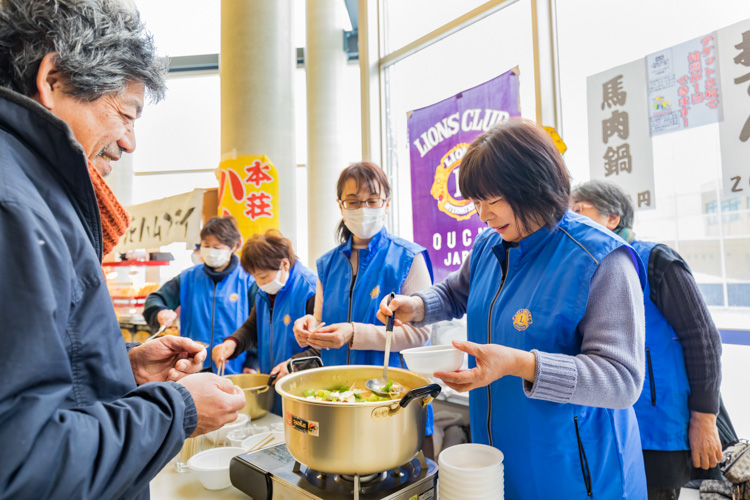 うめぇものまつりでは価格が1皿200円と統一されている。その中で収益を得られるよう工夫をしなければならない。毎回同じメニューを出し続ける方が楽ではあるが、いつも同じものだと飽きられてしまうだろう、と直近の回とはメニューを変えている。今年は馬肉鍋とおでん。おでんは過去にも出したことがあったが、馬肉鍋は初めての試みだ。買った人に満足してもらえるよう、2カ月ほど前から例会でメニューを選び、試行錯誤を繰り返し提供している。材料には地元の産品を使用するようにしており、この面でも地元に貢献しようという意図が明確だ。食品の衛生面や保健所への提出書類についても飲食店を経営するメンバーが気を配っており、トラブルが起きないようにしている。