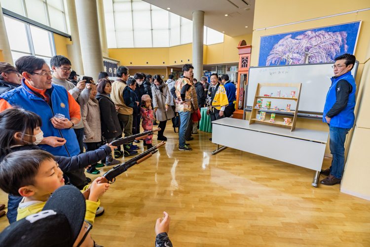 加えて、ライオンズクラブでは射的も実施。空気銃で撃ったコルク玉がお菓子に的中し落ちればそれをもらうことが出来る、昔ながらの射的だ。クラブは景品のお菓子を提供し、メンバーが進行を担当する。銃口の先に人が入らないよう気を配り、順番待ちの子どもたちの列を作る。子どもたちは待ちきれない様子で列に並んでいた。
