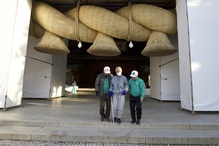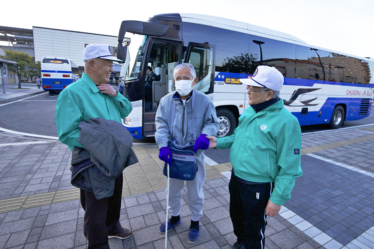 当日午前7時20分、前夜に愛知県・名古屋駅を出発した夜行バスが、出雲市駅に到着した。バスに乗っていたのは半谷さんだった。降車場では、半谷さんのガイドヘルパーを務める多伎町ライオンズクラブの竹下佳孝さんと鳥屋尾義明さんが待っていた。出迎えた二人が、受付までだいぶ時間があることを告げると、半谷さんは出雲大社への参詣を希望。3人はまず出雲大社で完走を祈願し、会場となる浜山公園へ向かった。