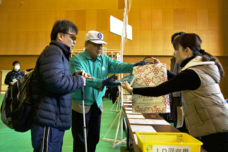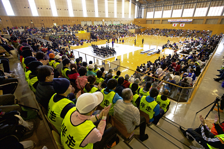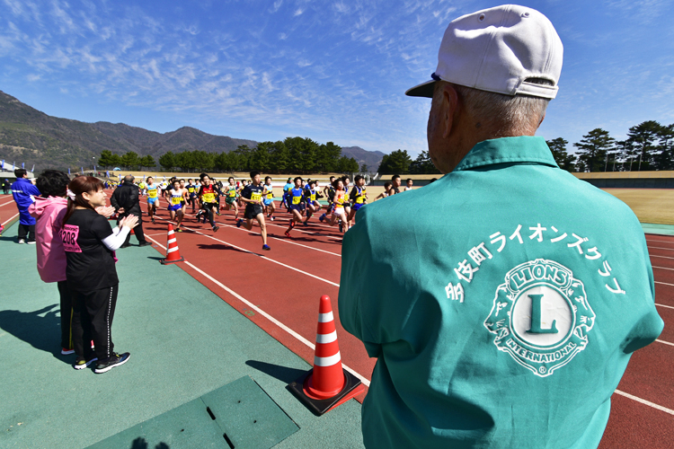 今年の第38回大会には、12人の視覚障害者ランナーがエントリー。「愛走フレンズ」からは42人の伴走者と14人のガイドヘルパーがサポートに当たり、多伎町ライオンズクラブも会員7人がガイドヘルパーとして参加した。