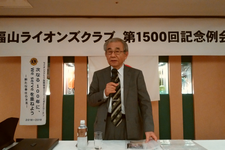 福山ライオンズクラブ(大本智三会長/81人)は4月23日、平成最後となる第1500回例会を迎えた。これを記念して歴史研究家の落健一先生をお招きし、2022年に築城400年を迎える福山城と福山市の歴史について、「古典と福山ー古典にふれて福山を楽しもうー」と題して講演して頂いた。