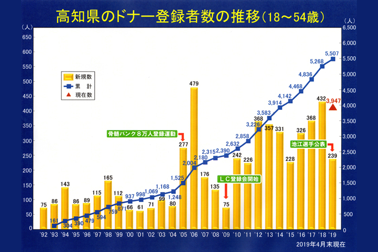 下記のグラフは、高知県内ドナー登録者数の推移である。高知黒潮ライオンズクラブが支援を開始した2009年以降の登録者数は、年平均300人以上。昨年は432人に上り、このうち約80%が当クラブの実績だった。現在27人のクラブ・メンバーが(財)日本骨髄バンクの説明員資格を取得し、県内各地で年間50回近くの登録会を行っている。11年からは県内のいくつかのライオンズクラブにも波及し、活動の輪が広がっていった。現在高知県のドナー登録は、高知黒潮ライオンズクラブを中心としたライオンズクラブの活動によるところが大きい。