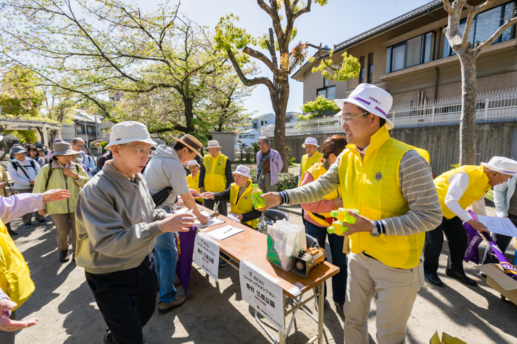 集合場所はJR環状線野田駅と阪神野田駅の中間にある江成公園。受付が始まる午前9時30分には、多くの人が集まっていた。この時間は中学生たちの出発時間でもある。一斉スタートでは人数が多くなり過ぎるため、中学生と一般の参加者は班を分けているのだ。どの班も引率するのはライオンズクラブのメンバー。吉野小学校、福島区役所、春日神社などを巡り、多くのフジ棚がある下福島公園でゴールとなる。