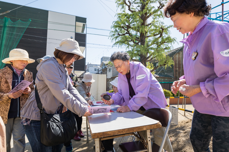 各地に配置されたチェックポイントでスタンプを押すのは、協力してくれている「のだふじの会」のメンバーだ。藤色のジャンパーに身を包み、参加者のスタンプ帳にスタンプを押していく。