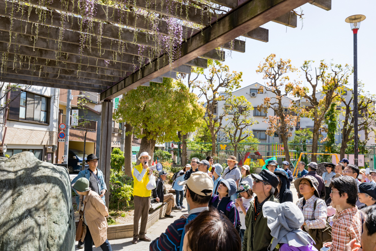 チェックポイント以外のフジ棚でも引率するライオンズのメンバーは解説をする。松下幸之助創業の碑が置かれている大開公園、ノダフジ発祥の地として知られている春日神社といった観光スポットはもちろんのこと、コース途中にあるフジ棚一つひとつに対し、一言二言でもコメントを残していく。今年は実施時期が少し早かったため、花が咲いていない場所もあったが、メンバーの説明によって咲いていないフジ棚でも十分に楽しめる内容になっていた。