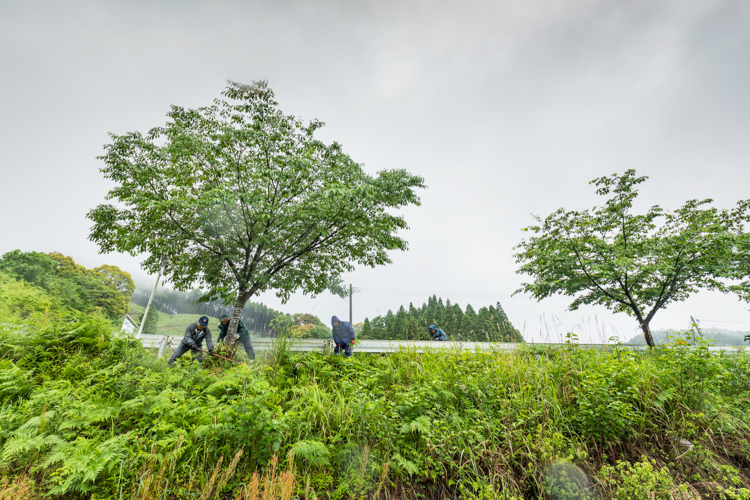 今年5月の清掃日は18日。それまで春らしい陽気が続いていた鹿児島県だったが、この日は朝からあいにくの雨。傘がなければすぐにずぶ濡れになってしまうような天気だったが、メンバーは集まって清掃をする。10kmにわたって植樹しているため、一度で全部を清掃することは不可能だ。毎月場所を変えて清掃することになる。