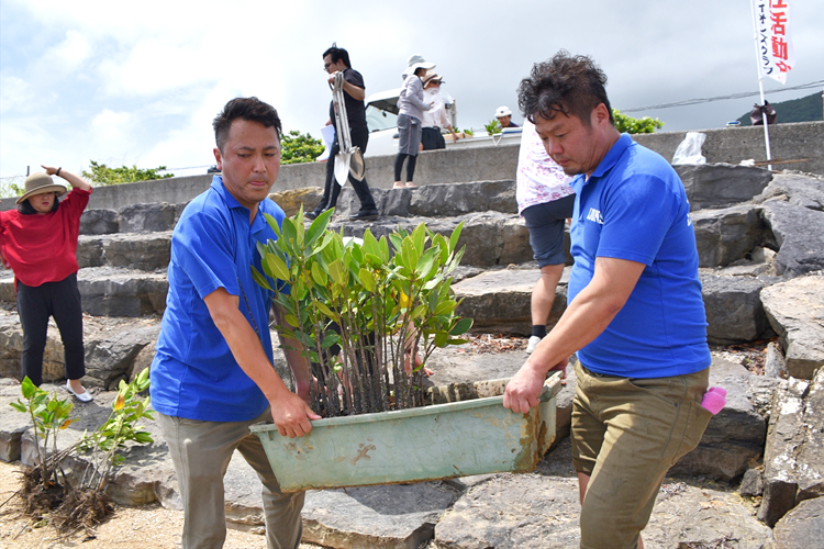東京八王子いちょうライオンズクラブ(石原重仁会長/57人)は2019年6月20日、沖縄県石垣市名蔵湾の海岸において、識名安信337複合地区ガバナー協議会議長が所属する八重山ライオンズクラブの協力の下、マングローブの植樹を実施した。