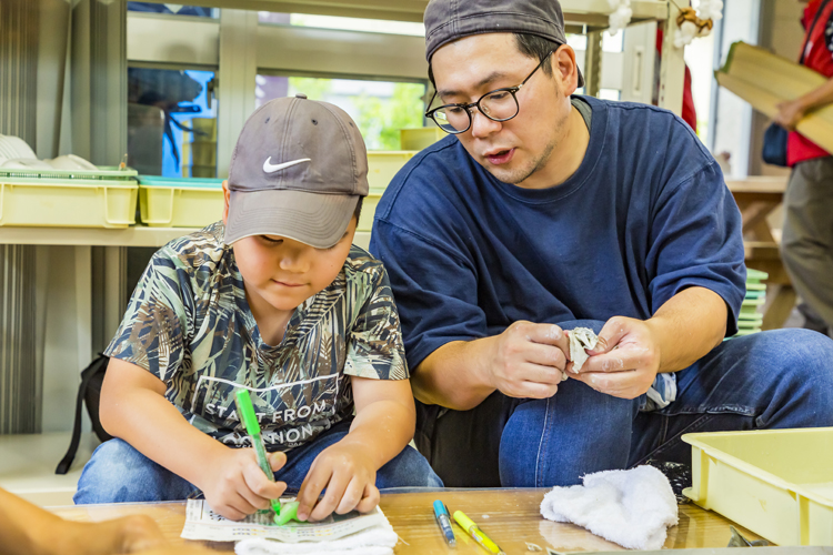 くびれている部分は粗めのサンドペーパーで丁寧に削り取り、ある程度形が出来たら、目の細かいサンドペーパーに変えて石を磨いていく。ざらざらしていた手触りが、だんだんすべすべになっていく。好みで、蛍光ペンで色付けし、新聞紙にこすりつけてツヤを出す。ぴかぴかになった石にひもを付けると、世界に一つだけの勾玉ペンダントの完成だ。この日参加した児童と保護者、学童保育の先生28人は、約1時間をかけてこの勾玉ペンダントを作り上げた。