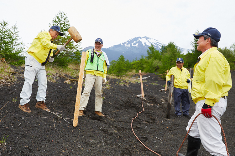 御殿場口に緑をよみがえらせる手助けをしようと、御殿場ライオンズクラブ(芹澤卓司2018-19年度会長/96人)が動き出したのは1991年。事業に着手するために調査検討委員を置いて、営林署や植物学者に相談しながら方法を探った。御殿場口付近の砂れき地にはバッコヤナギやイタドリ、フジアザミがいち早く進出し自生していた。そこでバッコヤナギの枝を採取して挿し木をし、苗を育てて御殿場口一帯に植える方法を採ることになった。生命力が強いバッコヤナギが定着し、他の植物が生える土壌をつくることを期待した。クラブは早速、苗の育成に着手し、92年6月に第1回としてバッコヤナギとイタドリの苗木400本を植えた。以来、毎年6月第1水曜日の早朝に「富士山例会」を開き、メンバー総出で植樹を行っている。