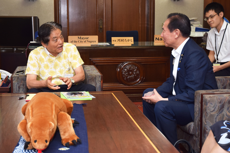チョイ国際会長夫妻は公式訪問に先立ち、この日の午前中、山田實紘元国際会長、安澤莊一、川島正行、渡部雅文各国際理事を伴って中日新聞社名古屋本社と名古屋市役所を表敬訪問した。中日新聞社の大島宇一郎社長には世界の多様な奉仕のニーズに応えるための資金を集めるLCIFキャンペーン100について説明。日本の中でも特に愛知県(334-A地区)が多大な貢献を果たしていることを伝えた。名古屋市の河村たかし市長(名古屋ライオンズクラブ名誉会員)とは通訳を介さずに英語で名古屋の印象などを語り合い、二人で韓国の歌手パティ・キムの曲をハミングする一幕もあり、終始とても和やかな雰囲気の懇談となった。