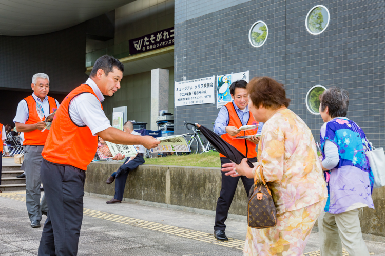 だが、音楽隊が編成されて間もない70年頃、警察と県民の距離は今ほど近くはなかったという。そこで音楽隊は県民に楽しんでもらえる演奏会を企画した。その際に、協力要請を受けたのが和歌山ライオンズクラブ(竹内和彦会長/51人)だ。以降、48年間にわたり県警音楽隊と二人三脚で演奏会を実施してきた。時間は勤め帰りの人も聴きに来られるように18時から19時。黄昏時に実施することから「たそがれコンサート」と名付け、毎年6月、7月、8月の第2第4金曜日に実施している。場所は和歌山県庁からも近い和歌山県立近代美術館と県立博物館の間のスペースだ。ライオンズクラブは市民と県警との懸け橋のような存在としてコンサートを支え続けてきた。