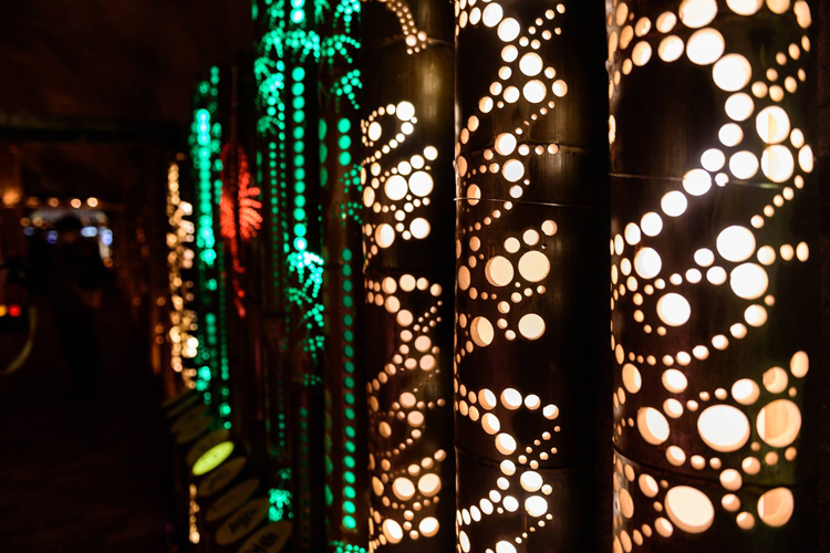 玉名では毎年8月に約9万人の人出でにぎわう玉名納涼花火大会が開かれますが、冬の祭はないんです。そこで冬の玉名を盛り上げようと、毎年12月半ばのクリスマス前から1月末まで「たまな粋燈(すいとう)」という催しを開いています。玉名温泉街の一角にある立願寺公園を約2000本の手作りの竹灯籠で飾り、幻想的な空間を作り出します。1カ月余りと長期間飾るので、竹灯籠の明かりはロウソクではなくLEDで照らします。