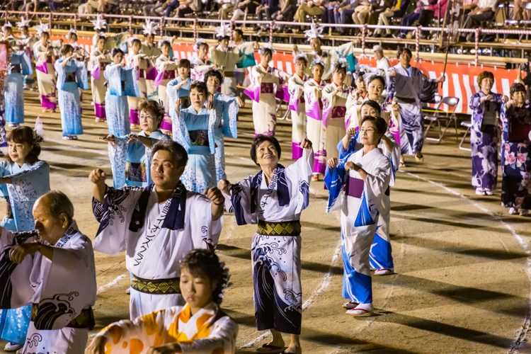 大分県大分市鶴崎地区は大野川と乙津川に挟まれ、北に別府湾を臨む。鶴崎では毎年8月、旧盆の次の土日に本場鶴崎踊大会が開催されている。鶴崎踊には軽快な「左衛門」と優雅な「猿丸太夫」という二つの踊りがあり、それぞれ住民に親しまれている。会場となる鶴崎公園グラウンドには多くの人が集まり、横を通る日豊本線は乗客が車窓から見られるように、この日だけ徐行運転をする。