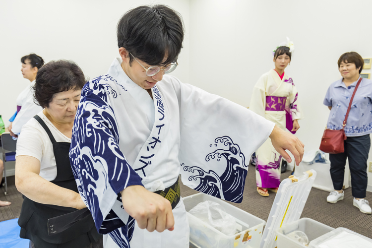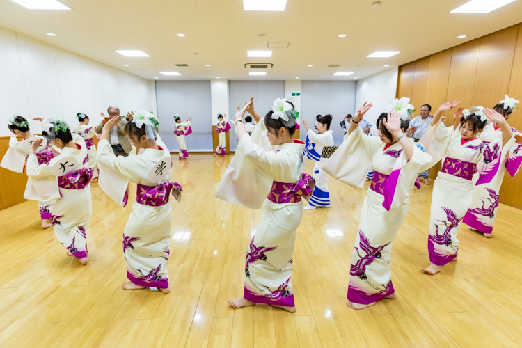 今年、踊りに参加したのは鶴崎臨海ライオンズクラブのメンバー10人と留学生19人。他のメンバーは着付けを手伝ったり、休憩中に水を出したりとサポートに回った。踊りの練習は大学に先生を派遣して実施。クラブ内でも稽古をする。合同練習は2回。当日も会場へ向かう前に合同で練習をする。
