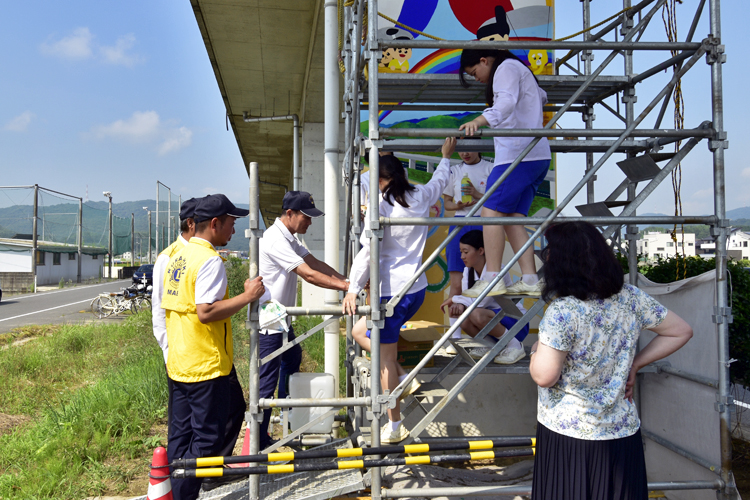 当初は単年度の企画だったが、地域や学校からの反響が大きく、クラブ内で事業の再開を検討。その結果、08年から継続事業として取り組むことになった。クラブでは足場と画材を提供し、メンバーの会社に協力してもらって絵を描く部分を白く塗って下地を整えている。絵の題材は各中学校に任せているが、真備のPRという視点は外さないようにしてもらい、美術部員たちが自分たちの地域を見直す機会にもしている。