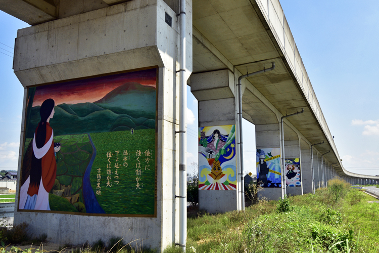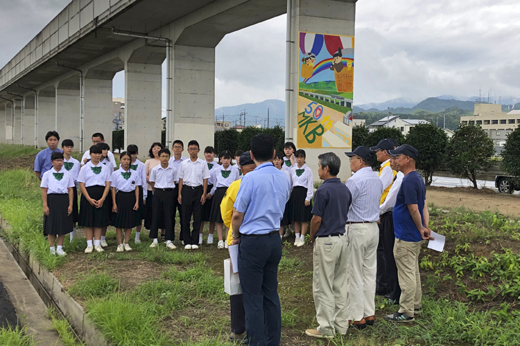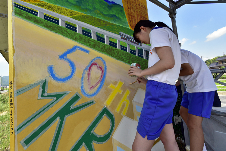 倉敷真備ライオンズクラブの「井原線橋脚に絵を描こう」の事業は05年のスタートだが、その前段として、倉敷市と合併する前の真備町によって03年に壁画制作が実施されたことがあった。この時は、倉敷芸術科大学の学生が、井原鉄道川辺宿駅の橋脚に横溝正史の探偵小説に登場する金田一耕助の影絵を描いた。そして真備町が倉敷市と合併した05年、それまでの真備ライオンズクラブから名称変更した新生・倉敷真備ライオンズクラブがその事業を継承。井原鉄道と交渉の上、青少年育成にも役立てようと、吉備真備駅に近い真備中学校と川辺宿駅に近い真備東中学校に声を掛け、橋脚をキャンバスに、地域をPRする大きな絵画を描いてもらうことにした。