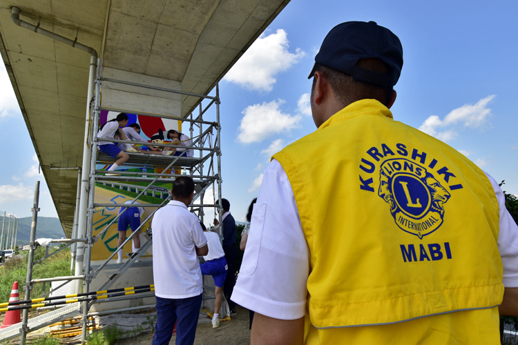 そんな状況での壁画制作だけに、倉敷真備ライオンズクラブの会員たちも感慨ひとしお。