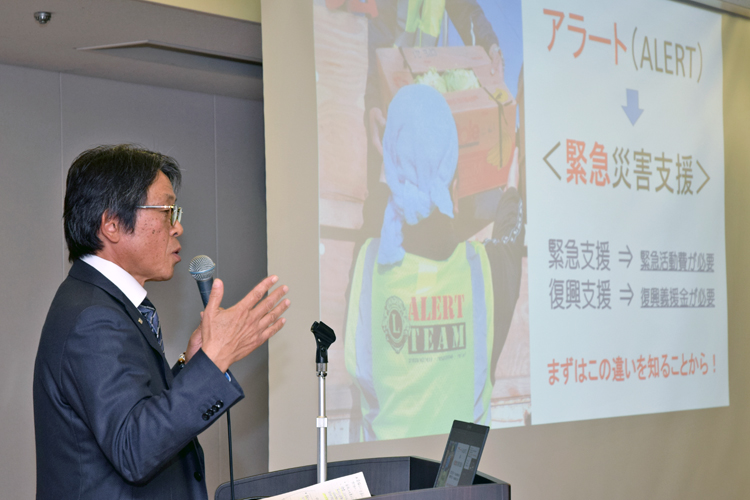続いて日本ライオンズ・アラート委員会アラート・チームの西日本リーダーを務める坂本惠市335複合地区アラート委員長が、今後の災害リスクと日本アラート体制の必要性について説明した。ライオンズには緊急支援を行うために必要なマンパワーも資金もそろっているのに、それが発揮出来ていないと指摘。335複合地区、335-B地区での活動を例に挙げながら、迅速で的確なアラート活動を行うためには、各クラブで理事会・例会の承認を待たずに拠出出来るアラート準備金を確保することや地元の社会福祉協議会と平時から密接な関係を構築すること、クラブ内にアラート委員会を設置することが必須だとし、地区においてはSNSを活用した災害時の緊急連絡網を構築して定期的な訓練を行う必要があると述べた。