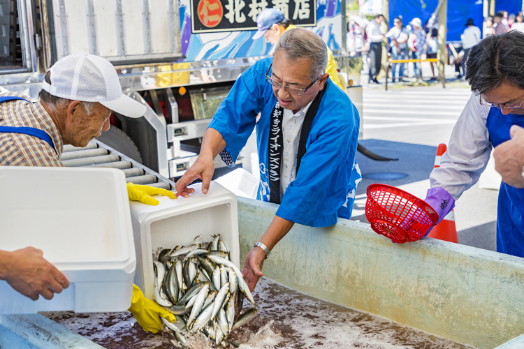 列の管理も大変だ。整理券を配り、不満が出ないようにする。イワシの配布時は10人程度に区切って水槽の所へと案内し、混雑し過ぎないように気を付ける。1人が持って帰るイワシの量は20〜30匹。以前、家から何枚もビニール袋を持ってきて、多く持って帰った人がいた。一人がたくさん持って帰ってしまうと後ろの人までイワシが回らなくなる。そこでイワシを入れるために色の付いた袋を入り口で配布し、そうしたことが起こらないようにしている。袋の色を毎年変え、家から持ってきた袋と区別出来るようにしているのだ。