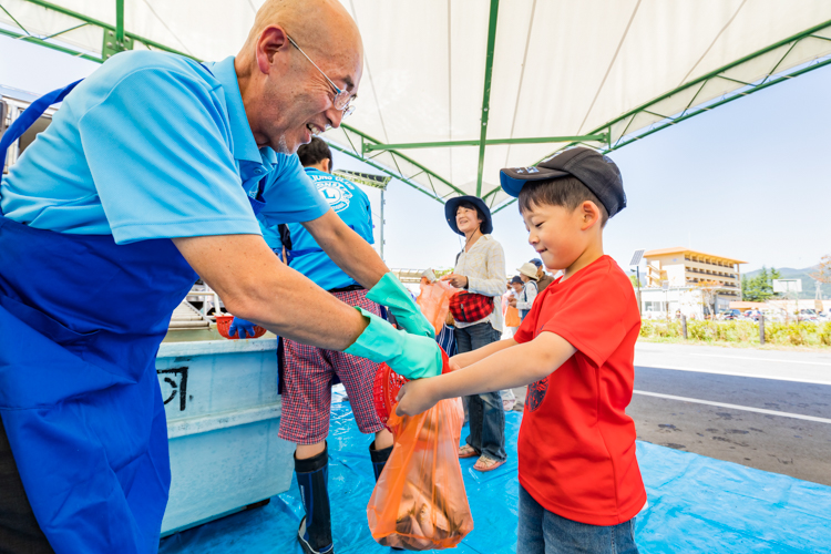 今年も9月14日に下諏訪町の赤砂崎公園でイワシの無料配布が行われた。前日に水揚げされた新鮮なイワシ約2.5トンを配布する。12時に配布開始予定だったが、午前中から長蛇の列が出来ていた。例年、クラブで準備を始めるよりも前から先頭の人が並び始めるという。