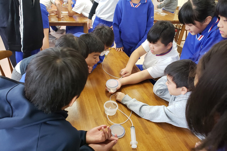 出前授業では、実験を通して空気や重力が無い宇宙での直射熱や日陰の物質対射温度の違いや、真空に耐える物質の変化を学んだ。子どもたちは目を皿のようにして実験を見つめ、驚きと歓声を上げていた。彼らの目の輝きと笑顔がとてもうれしかった。現場の教職員の方々も子どもたちの様子に驚かれたようで、「いつもこの顔付きで授業に励んでくれたらねえ」と嘆き節が聞かれるほどに、この事業の意義と有効性を実感出来た一日となった。