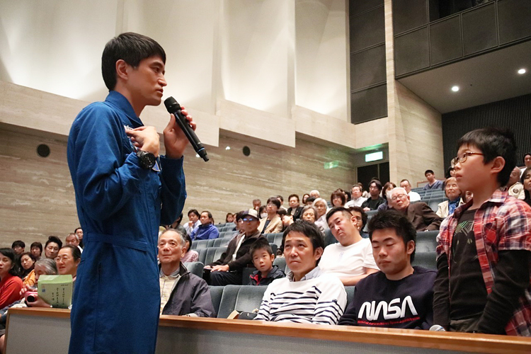 翌日の講演会では現役宇宙飛行士の大西卓哉氏をお迎えして、無限に広がる大宇宙の夢の話や、国際宇宙ステーションでの長期滞在生活体験の中から地上では想像の付かない話、また400kmの上空から見るまん丸で美しい地球のすばらしさを語って頂いた。子どもたちは夢と希望と共に、自分たちの住む地球の環境保全の大切さにも気付いてくれたと思う。