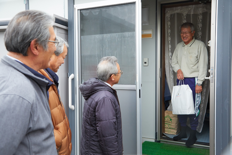 もう一つ、クラブが結成された1974年から続いている事業をどうするか、という問題についても協議する必要があった。その事業は、年末に80歳以上の独居老人宅を訪問し、正月用品を届けるというもの。そう、仮設住宅訪問の元になった取り組みだ。今回の地震があったことで、町内の独居老人が家族の元へ引っ越すなどして所在がつかめなくなり、事業の継続が困難であることが判明。支援対象が把握出来ないため、こちらの事業は一時中断することになった。代わりに浮上したのが、11月から第1期の入居が始まる仮設住宅を訪れ、支援物資を渡すというアイデアだ。これまでのノウハウをそのまま生かすことが出来る上、全国から集まった支援金を被災者のために活用することも出来る。こうして11月5日にメンバー全員の承諾を得た後に、新たな事業はスタートした。