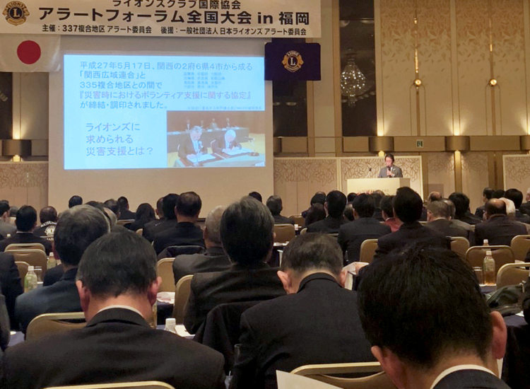 2020年2月11日に福岡市で開催されたフォーラムには、330複合地区から337複合地区まで全国から約450人の会員が集まった。4時間を超える開催時間が長く感じられないほど、充実した内容となった。まず、主催者を代表して337複合地区の乗田泰議長が開会あいさつ。次に来賓として、2017年の九州北部豪雨災害で大きな被害が発生した福岡県東峰村の澁谷博昭村長から、ライオンズクラブの支援に対するお礼の言葉と感謝状を頂戴した。その後、日本ライオンズの識名安信理事長並びに同アラート委員会の小林聰委員長からあいさつがあり、ライオンズクラブの緊急災害支援の重要性が語られた。更に、332-C地区(宮城県)の木川田明弘地区ガバナーからは、昨年の台風19号の災害支援に対する感謝の言葉が述べられた。