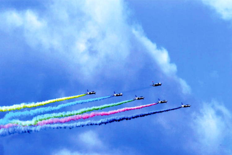 ようやく五輪が出来上がり、用意した「合同アクティビティ」の看板を運び出して記念写真を撮る。厚い雲が空を覆い、ブルーインパルスは予定時刻を過ぎてもなかなか飛ばない。やっと飛んでも、スモークが強風に流され五輪にならない。空の五輪をバックに地面の五輪と看板を一緒に撮りたいと思っていたが、残念ながら実現しなかった。空に描いた五輪は消えてしまったが、再び飛んできたブルーインパルスの描く美しい直線は、見ていた人に勇気を与えたことだろう。